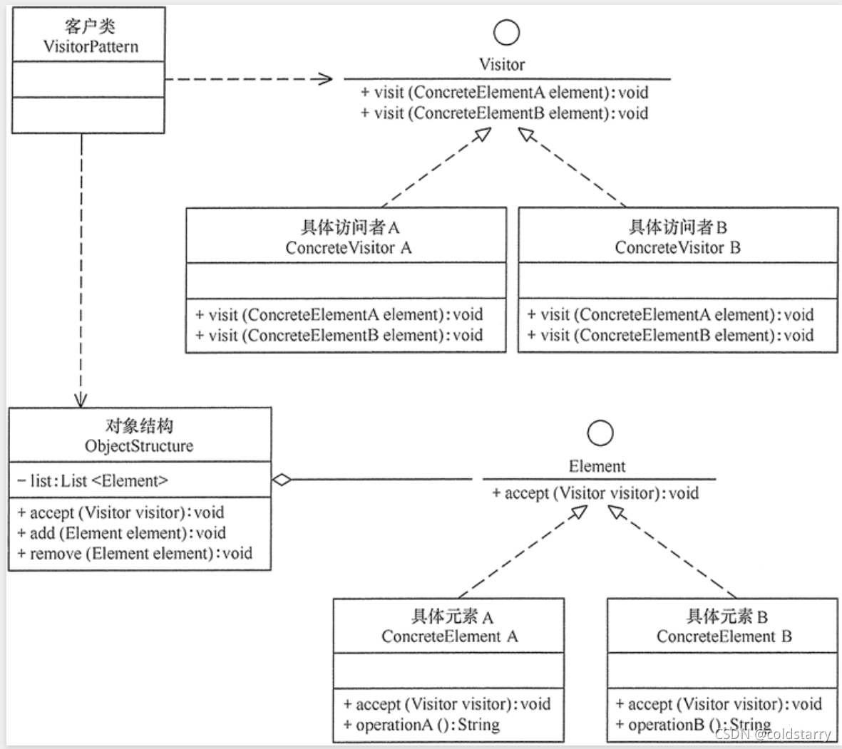 - 对象结构(Object Structure)角色:是一个包含元素角色的容器,提供让访问者对象遍历容器中的所有元素的方法,通常由 List、Set、Map 等聚合类实现。
