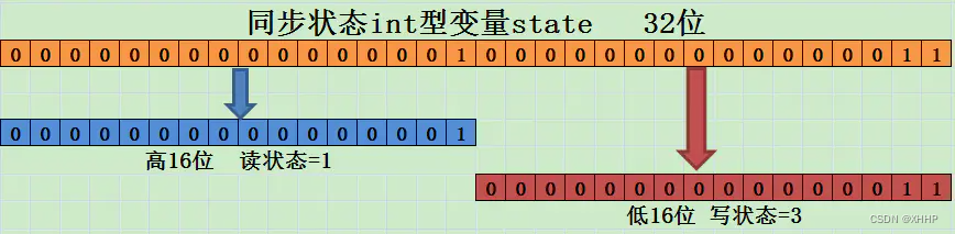 那么内部又是怎么实现这个读锁和写锁的呢。由于一个类既要维护读锁又要维护写锁,那么这两个锁的状态又是如何区分的。在ReentrantReadWriteLock对象内部维护了一个读写状态: