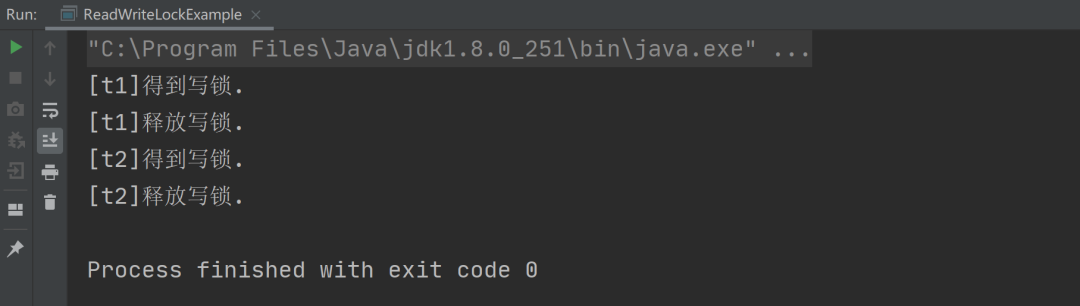 多个线程同时使用写锁也是互斥的,这称之为写写互斥,如下代码所示: