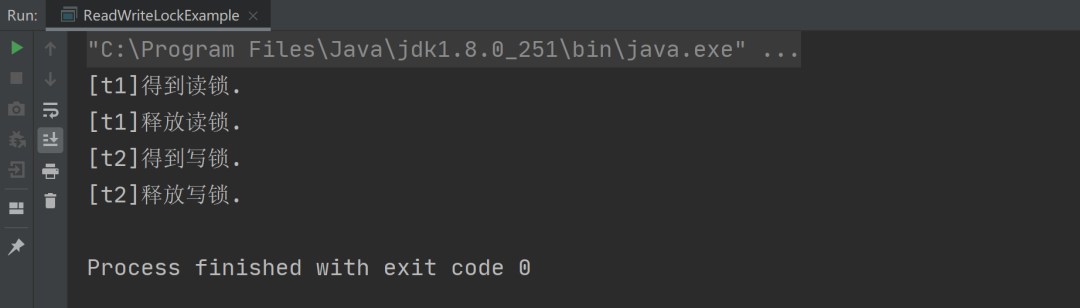 读锁和写锁同时使用是互斥的(也就是不能同时获得),这称之为读写互斥,如下代码所示: