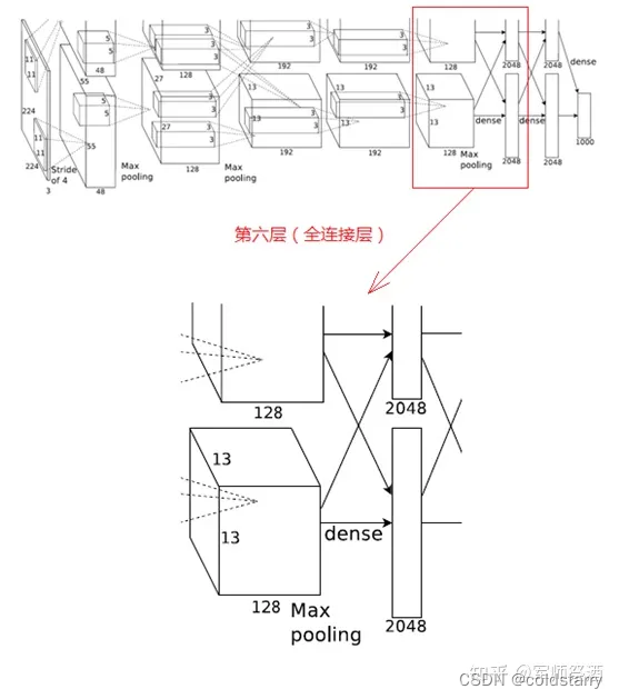 2 组 13×13×128 像素层分别在 2 个不同 GPU 中进行池化运算处理,池化运算的尺寸为 3×3,步长为 2,池化后图像的尺寸为 (13-3)/2+1=6,即池化后像素的规模为两组 6×6×128 的像素层数据,共有 6×6×256 的像素层数据。