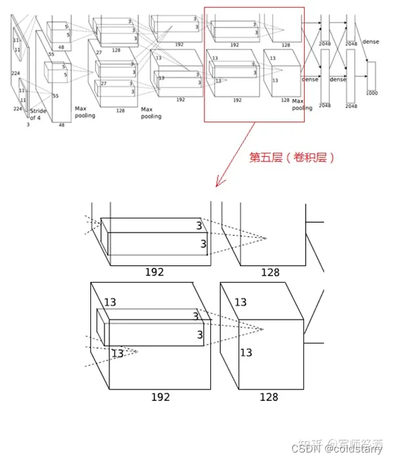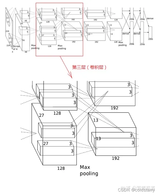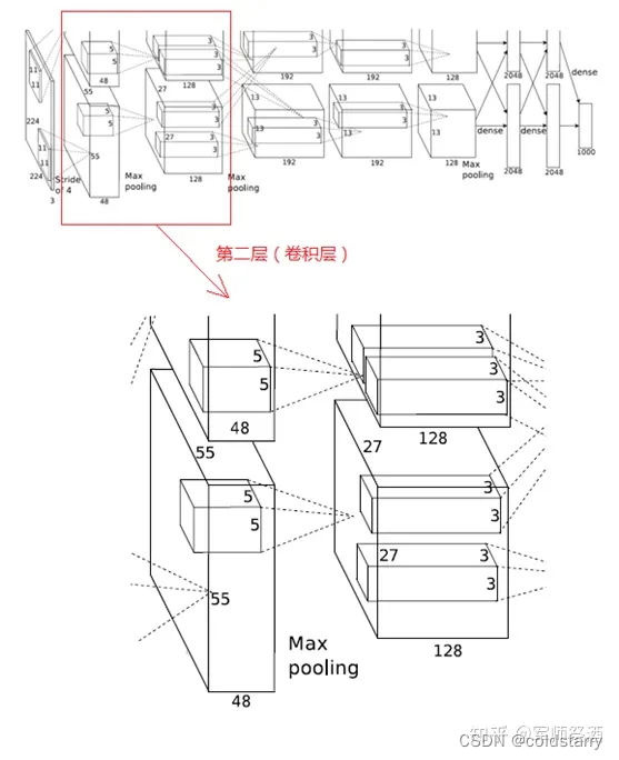 本层使用了 256 个 5×5×48 的卷积核,同样也是被分成两组,每组为 128 个,分给两个 GPU 进行卷积运算,结果生成两组 27×27×128 个卷积后的像素层。