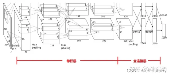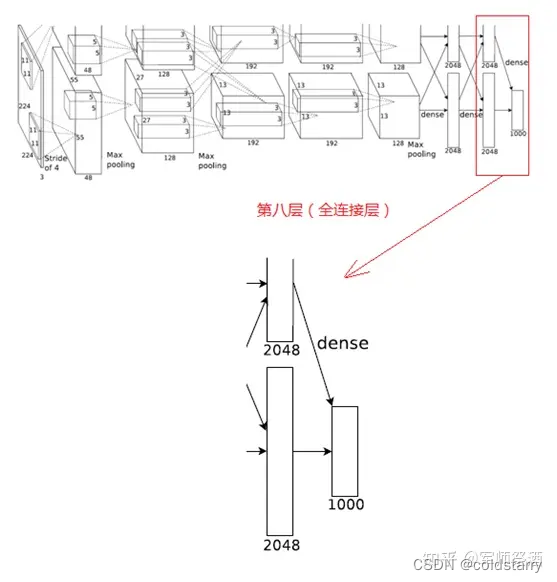 AlexNet 网络结构共有 8 层,前面 5 层是卷积层,后面 3 层是全连接层,最后一个全连接层的输出传递给一个 1000 路的 softmax 层,对应 1000 个类标签的分布。