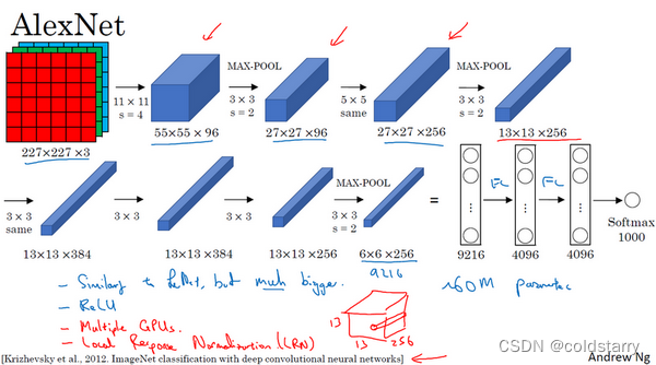 AlexNet网络结构看起来相对复杂,包含大量超参数,这些数字(55×55×96、27×27×96、27×27×256……)都是Alex Krizhevsky及其合著者不得不给出的。