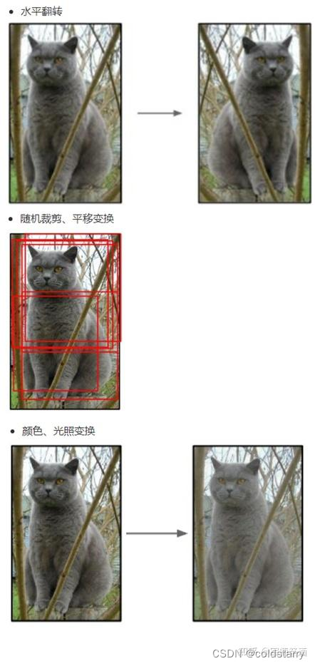 其中,最简单、通用的图像数据变形的方式:水平翻转图像,从原始图像中随机裁剪、平移变换,颜色、光照变换,如下图所示: