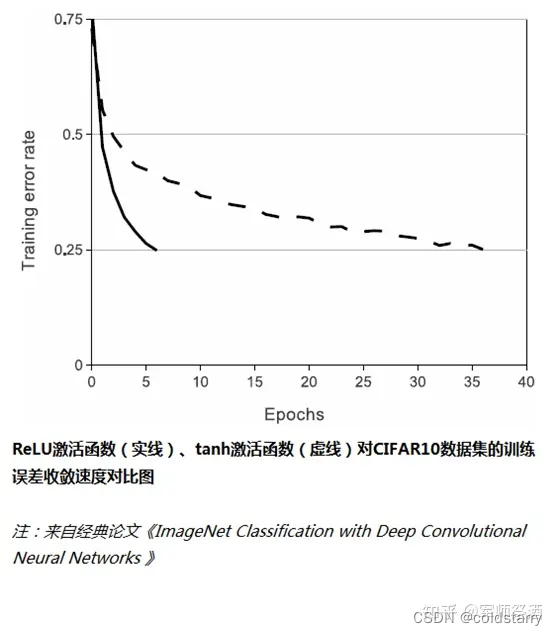 使用 ReLU 替代 Sigmoid/tanh,由于 ReLU 是线性的,且导数始终为 1,计算量大大减少,收敛速度会比 Sigmoid/tanh 快很多,如下图所示: