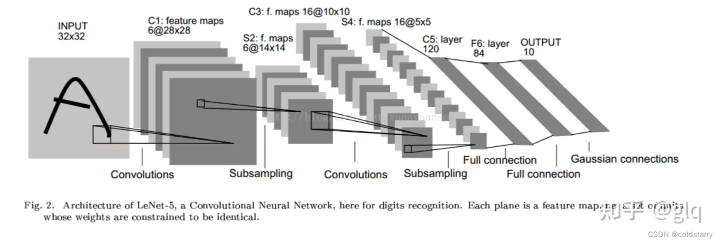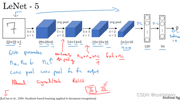 - 从左往右看,随着网络越来越深,图像的高度和宽度在缩小,从最初的32×32缩小到28×28,再到14×14、10×10,最后只有5×5。与此同时,随着网络层次的加深,通道数量一直在增加,从1增加到6个,再到16个。这种架构,可以支持的入参 数量,没有那么多,对于高清图像的处理没那么好