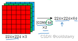 - 进行第一个卷积:用64个3×3的过滤器对输入图像进行卷积,输出结果是224×224×64,因为使用了same卷积,通道数量也一样,