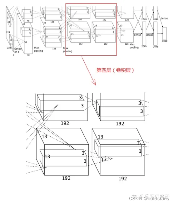 这一层中每个 GPU 都有 192 个卷积核,每个卷积核的尺寸是 3×3×256。因此,每个 GPU 中的卷积核都能对 2 组 13×13×128 的像素层的所有数据进行卷积运算。如该层的结构图所示,两个 GPU 有通过交叉的虚线连接,也就是说每个 GPU 要处理来自前一层的所有 GPU 的输入。