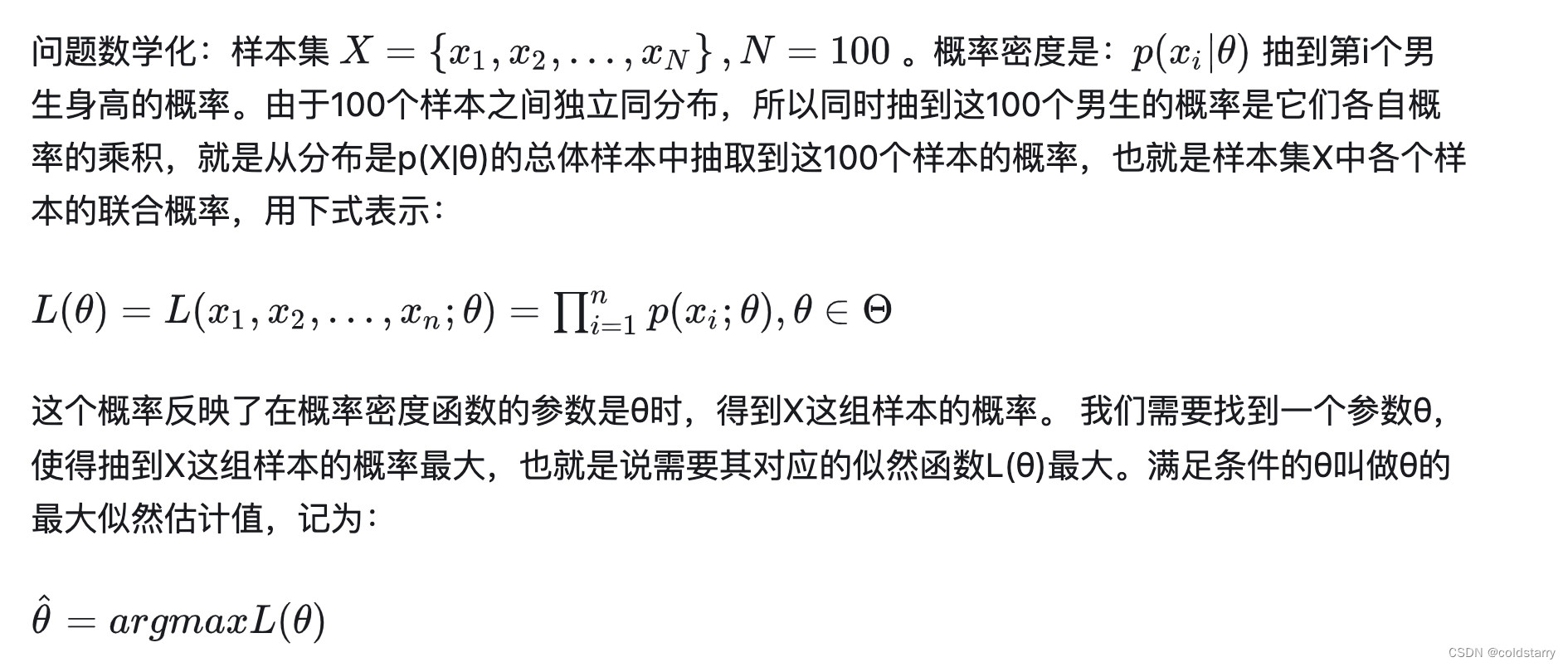 我们已知的条件有两个:样本服从的分布模型、随机抽取的样本。我们需要求解模型的参数。根据已知条件,通过极大似然估计,求出未知参数。总的来说:极大似然估计就是用来估计模型参数的统计学方法。