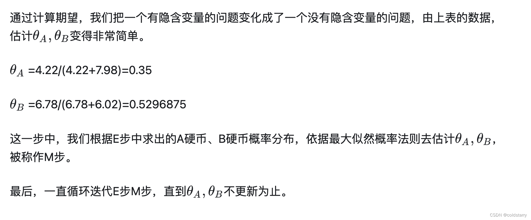 (4)这时候两个分布的概率也变了,然后重复步骤(1)至(3),直到参数不发生变化为止。