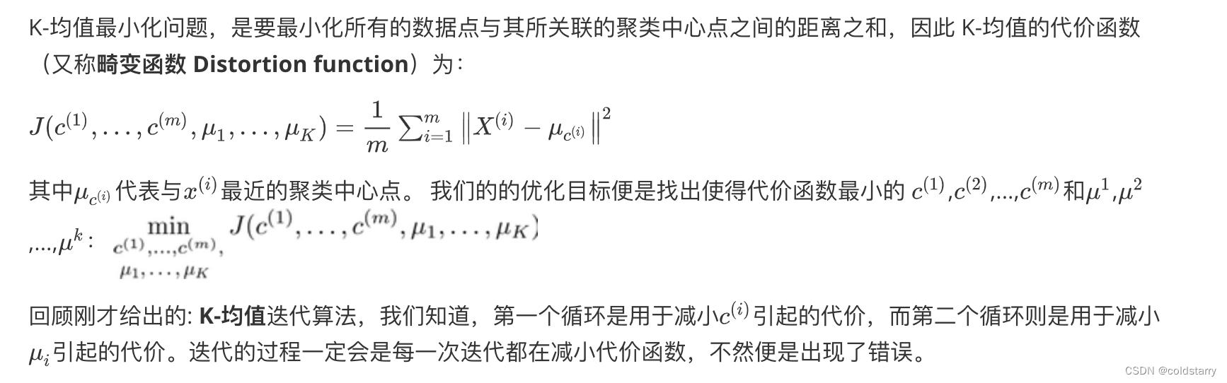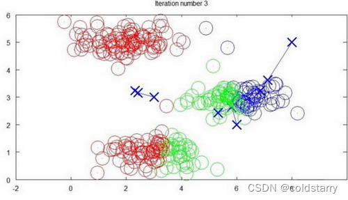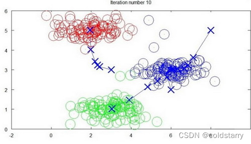 算法分为两个步骤,第一个for循环是赋值步骤,即:对于每一个样例,计算其应该属于的类。第二个for循环是聚类中心的移动,即:对于每一个类,重新计算该类的质心