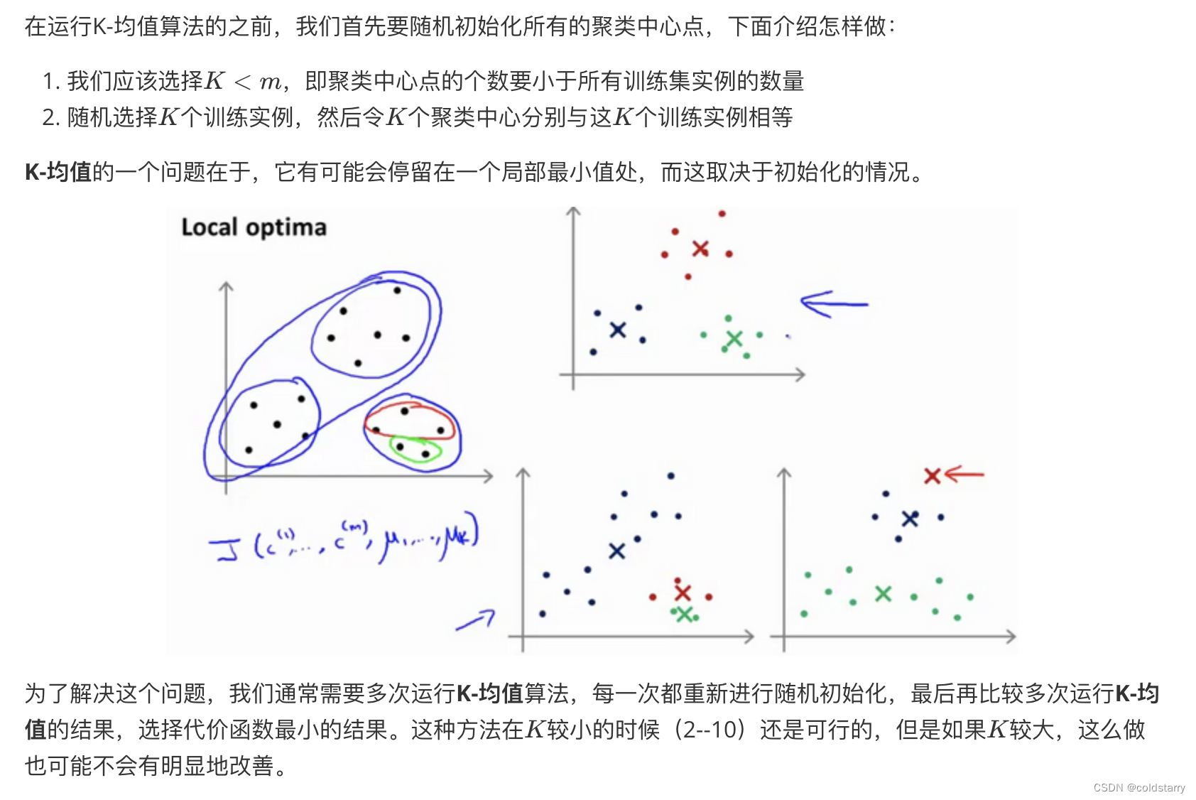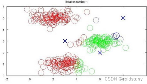 - 首先选择个随机的点,称为聚类中心(cluster centroids);