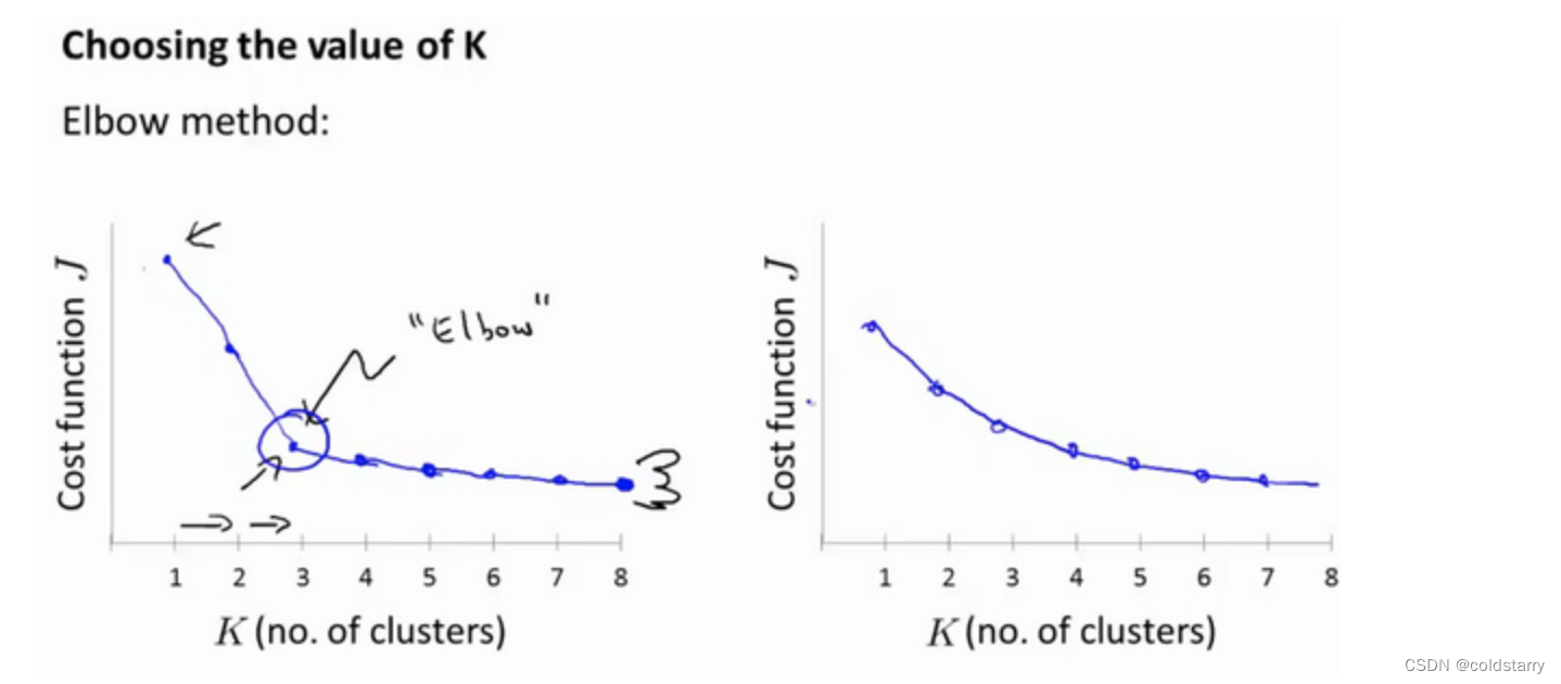 没有所谓最好的选择聚类数的方法,通常是需要根据不同的问题,人工进行选择的。选择的时候思考我们运用K-均值算法聚类的动机是什么,然后选择能最好服务于该目的标聚类数。