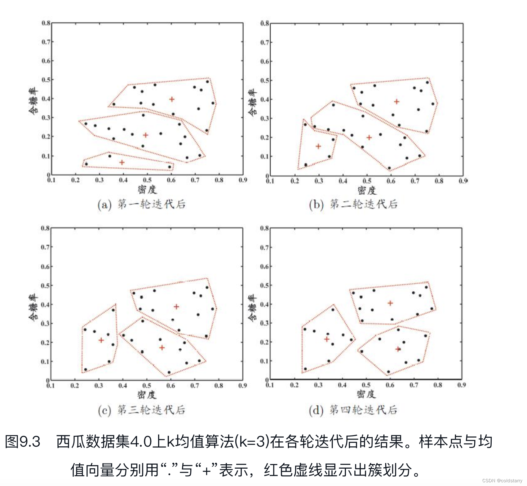 4) 更新当前均值向量后,不断重复上述过程,如图9.3所示,第五轮迭代产生的结果与第四轮迭代相同,于是算法停止,得到最终的簇划分