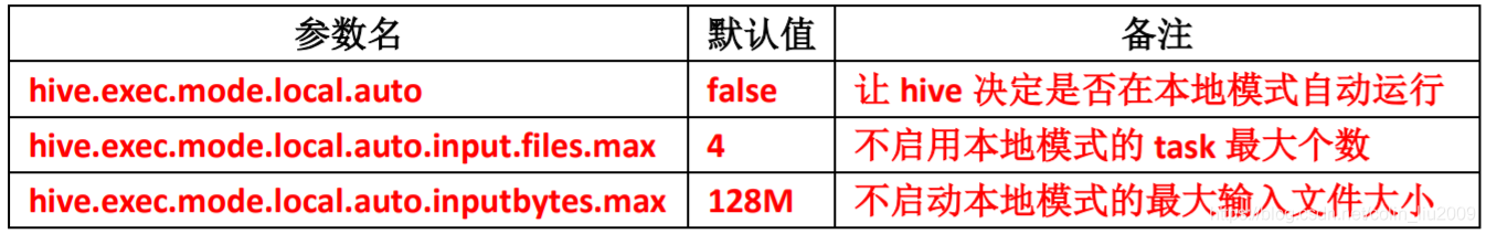 对于大多数情况,Hive可以通过本地模式在单台机器上处理所有任务。对于小数据,执行时间可以明显被缩短。通过set hive.exec.mode.local.auto = true(默认为false)设置为本地模式,本地模式涉及到三个参数: