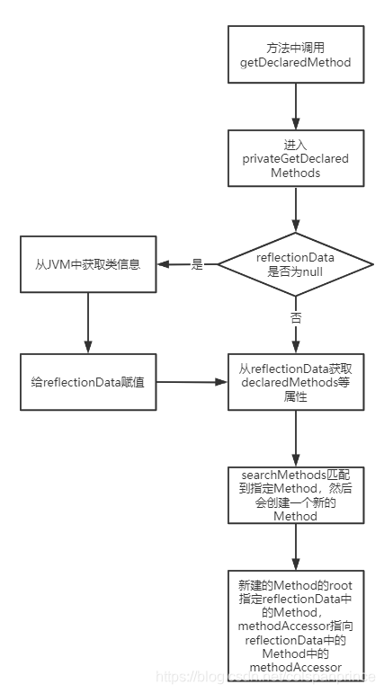 调用Class.getDeclaredMethod方法时,每个Class对象内部有个ReflectionData对象,它是个软引用,如果是null,就会去jvm中取出类信息并赋值。后续调用就可以直接从这个ReflectionData对象中获取,提高效率。