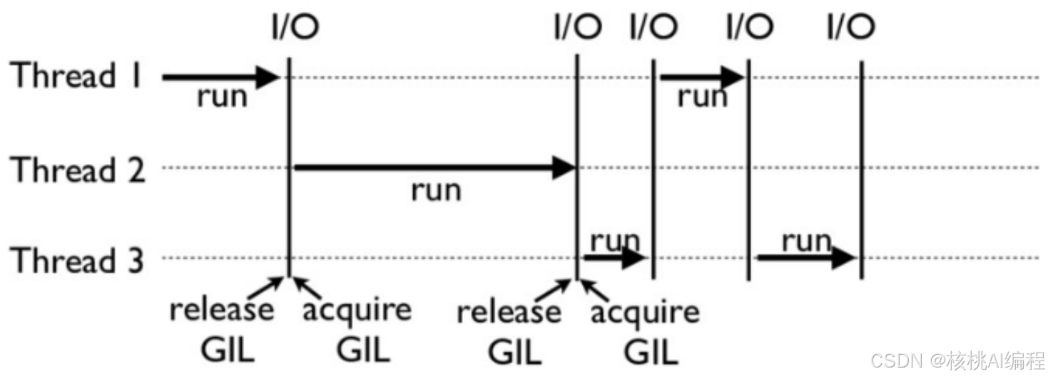 - I/O操作时释放:执行I/O操作时,解释器会释放GIL,让其他线程有机会执行。