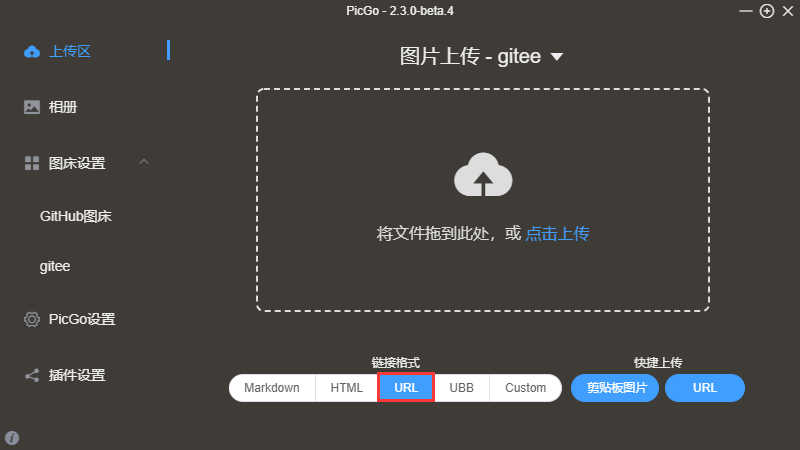 在上传区选择链接格式为URL就可以将图片上传上去了