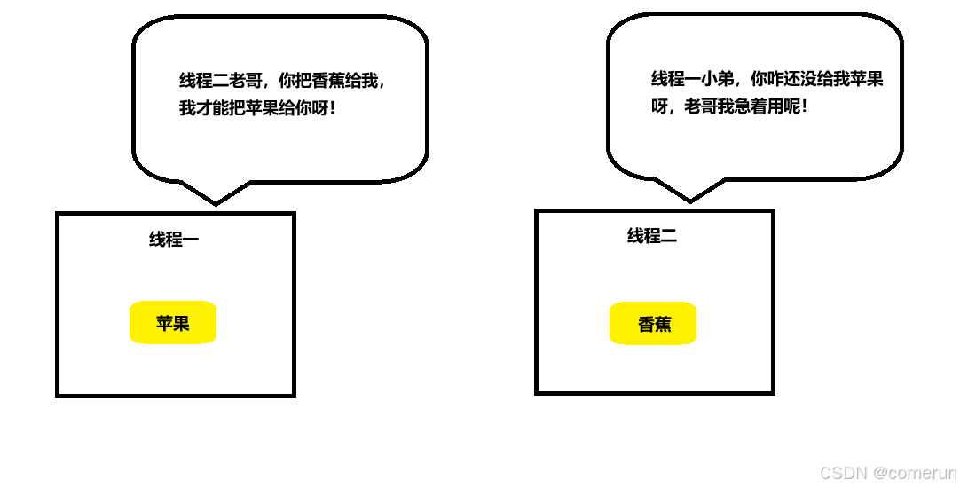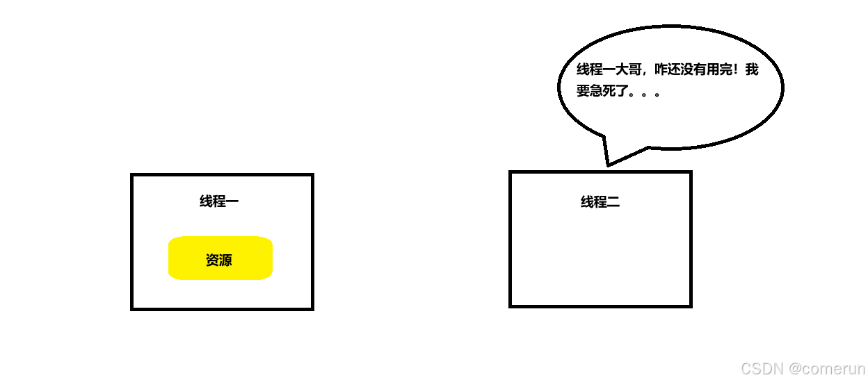 那这个死锁和我们上面画的“线程兄弟”有什么区别呢?答案是线程二中没有线程一想要的资源,那么线程二可以等待线程一使用完后就可以接着使用资源了,我们可以换个场景,还是这俩难兄难弟!