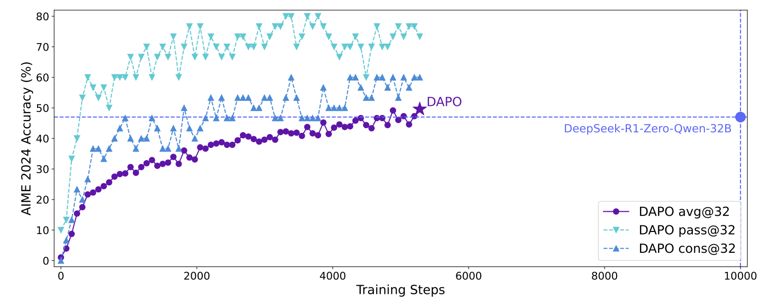 论文提出解耦裁剪与动态采样策略优化(DAPO)算法,专门针对大规模语言模型(LLMs)的强化学习训练。采用四种技术在一定程度上解决了近端策略优化(PPO)和组相对策略优化(GRPO)存在的问题: