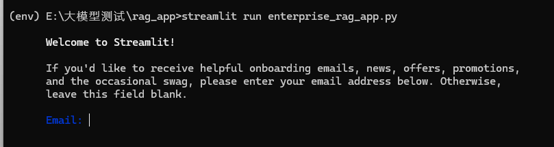E: cd "大模型测试" env\Scripts\activate.bat - 进入 rag_app 目录并启动 Streamlit 应用:
