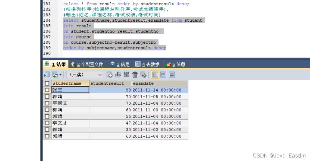 /*输出(姓名,课程名称,课程所在年级名称,考试成绩,考试时间)*/