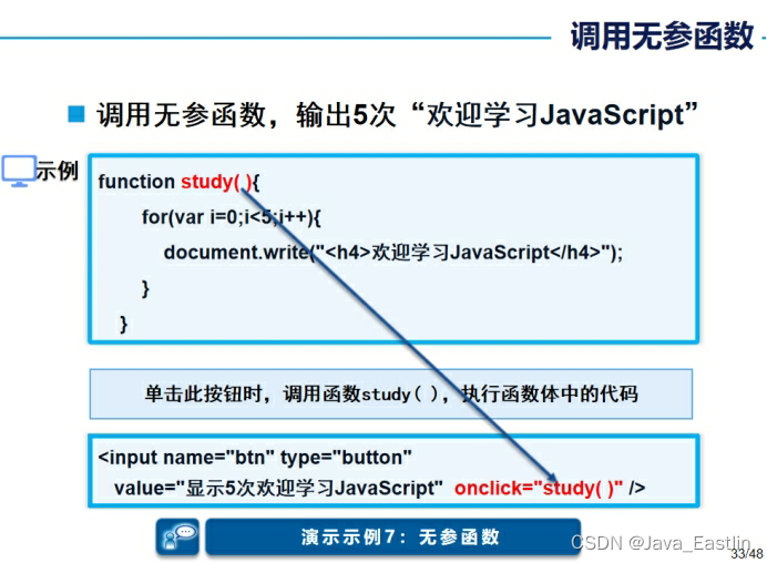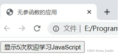 <input name="btn" type="button" value="显示5次欢迎学习JavaScript" onclick="study( )" />