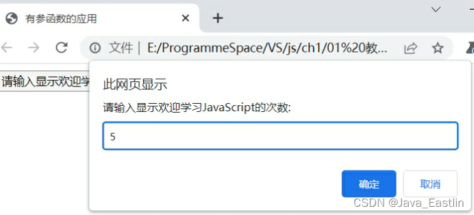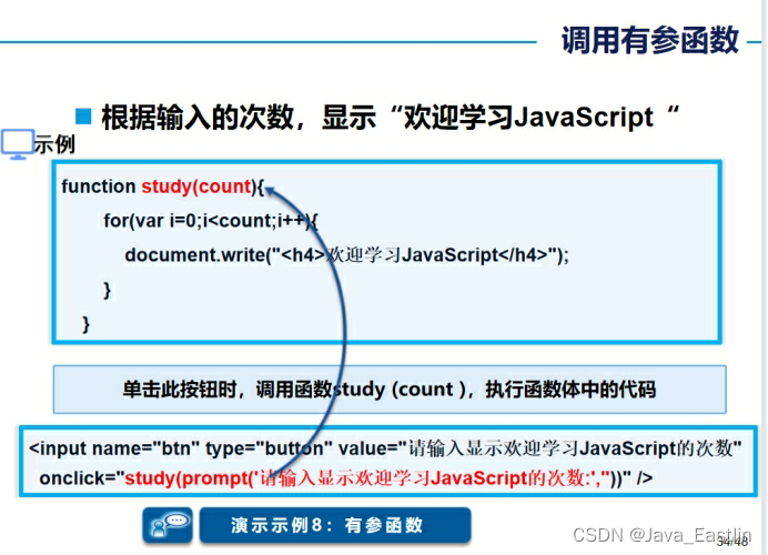 <input name="btn" type="button" value="请输入显示欢迎学习JavaScript的次数" onclick="study(prompt('请输入显示欢迎学习JavaScript的次数:',''))" />