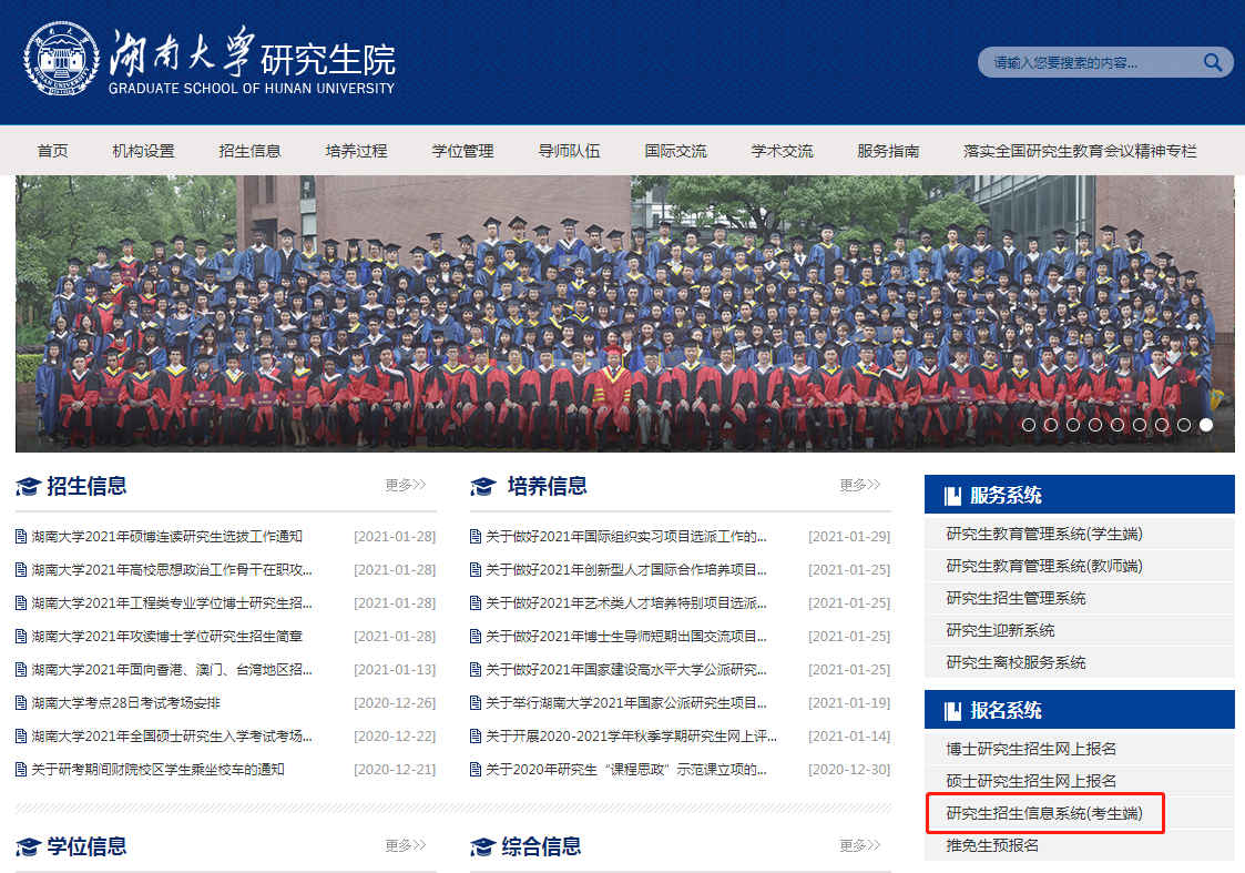 计算机考研初试之前一般是先选择院校,而考生可以通过报考院校研究生院查询自己的初试成绩,就拿2021年湖南大学来说: