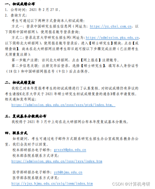 计算机考研初试之前一般是先选择院校,而考生可以通过报考院校研究生院查询自己的初试成绩,就拿2021年北京大学来说: