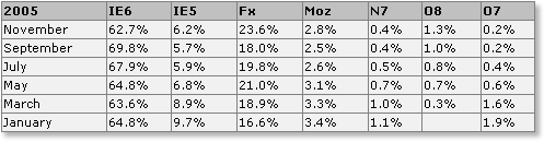 Firefox 1.0 于 2004 年 11 月推出,2005年1月,它的市场占有率已经达到 16.6%,想想 Opera 长达十年的发展仍未突破 2%,就知道这一成绩是非常可观的。2005 是 Firefox 真正成熟并持续争夺 IE 市场最关键的一年,让我们看看这一年各大浏览器的份额: