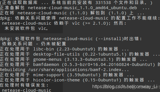 解决依赖问题后,然后继续输入命令重新安装:sudo dpkg -i netease-cloud-music_1.1.0_amd64_ubuntu.deb(此一步好像是可有可无,我是尝试了两次。重新安装了和没重新安装,可以都试一下哪种可以。)