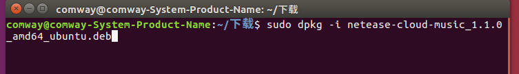 输入命令 sudo dpkg -i netease-cloud-music_1.1.0_amd64_ubuntu.deb(netease-cloud-music_1.1.0_amd64_ubuntu.deb为文件名)如下图所示: