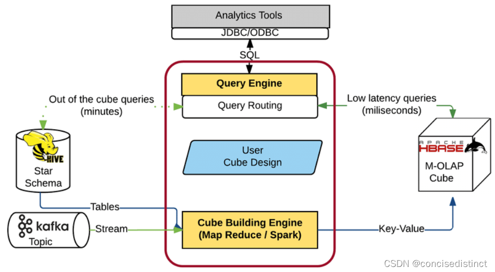 Kylin的架构主要包括数据源、元数据存储、构建引擎、查询引擎和用户接口等部分。下图展示了Kylin的总体架构: