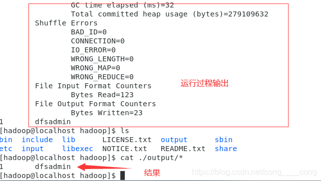 执行成功后如下所示,输出了作业的相关信息,输出的结果是符合正则的单词 dfsadmin 出现了1次