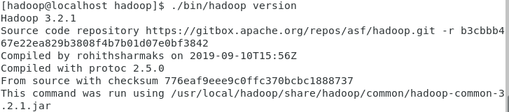 Hadoop 解压后即可使用。输入如下命令来检查 Hadoop 是否可用,成功则会显示 Hadoop 版本信息: