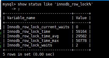 Innodb_row_lock_current_waits: 当前正在等待锁定的数量; Innodb_row_lock_time: 从系统启动到现在锁定总时间长度; Innodb_row_lock_time_avg: 每次等待所花平均时间; Innodb_row_lock_time_max: 从系统启动到现在等待最常的一次所花的时间; Innodb_row_lock_waits: 系统启动后到现在总共等待的次数;