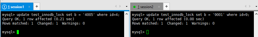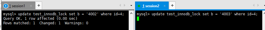 session2进入阻塞状态。当session1执行commit后,session2阻塞状态解除。两边再次执行commit后,数据一致。