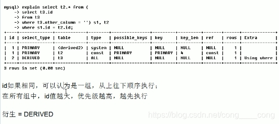 在FROM列表中包含的子查询被标记为DERIVED(衍生)MySQL会递归执行这些子查询,把结果放在临时表里。