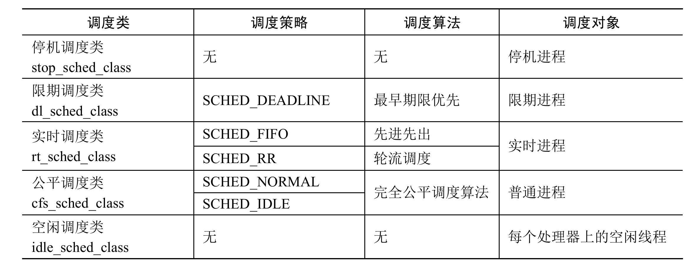 内核目前实现了5 种调度类,如下表所示。