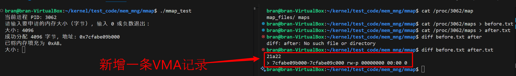 每执行一次mmap,/proc/pid/maps下都会新增一条VMA的记录。