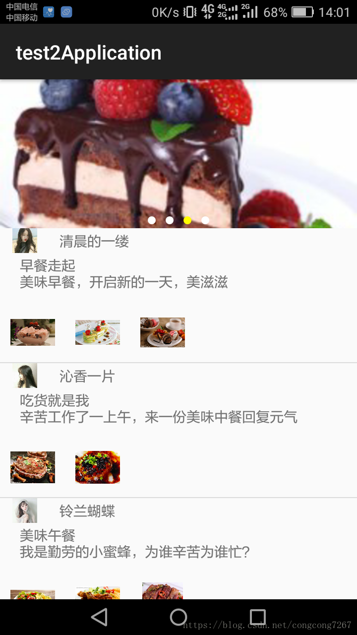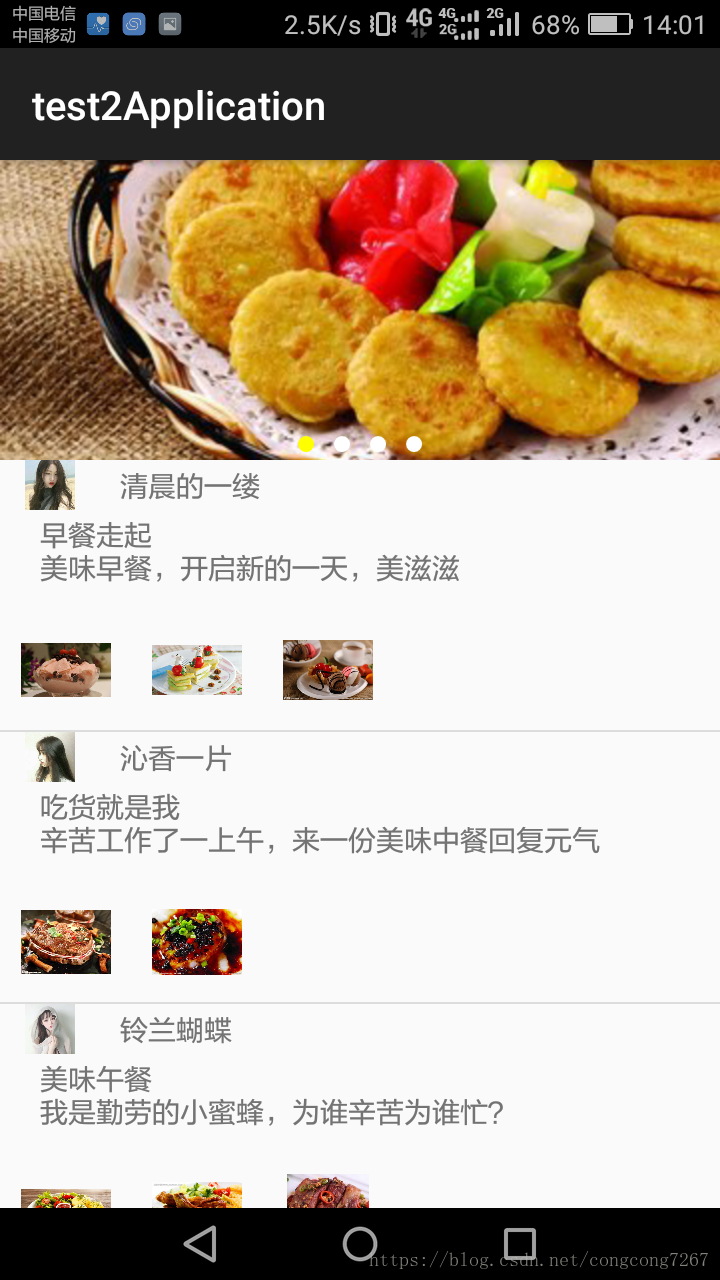 上述代码里的其他功能是本人在安卓实训时和小伙伴一起合作仿做美食天下app的部分代码,若读者有兴趣,可以到我的github里下载源码运行看效果