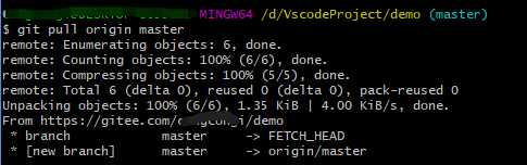 5.在Git窗口输入git pull origin master,master是指主分支,是在创建仓库时,默认创建的一个分支,这样就将远程库的更改拉取同步到本地了(提交更改之前或是做更改之前,习惯性同步云端与本地)