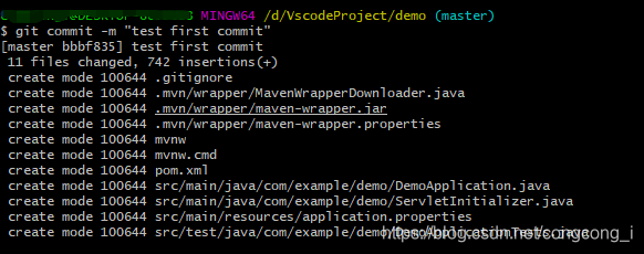 7.Git窗口输入git commit -m "first commit",双引号中是提交代码的备注信息,这样就将更改提交到head了,head指向最后一次提交的结果
