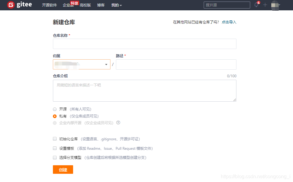 3.在云端Gitee建好空的仓库,点击新建仓库,输入仓库名称就可以了 ,路径会根据输入的仓库名称生成,然后直接点创建