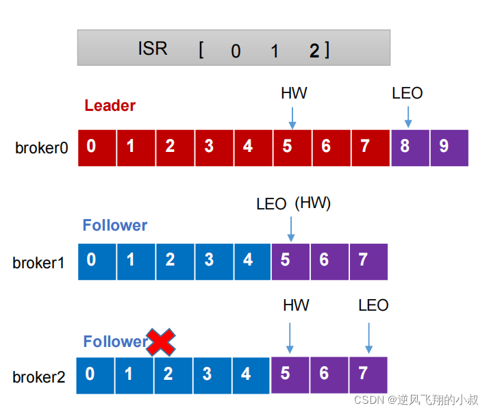 具体来说,leader和follower出现故障时各自的处理细节是不同的,假设kafka集群中有3个服务实例,对应到ISR中存储的就是3个brokerid的信息,假如brokerid为0的服务是leader,其他两个是follower,在broker实际工作过程中,发往broker的数据在leader和follower上均维持着一个HW和LEO,从实际经验来看,由于leader对外提供读写服务,而follower同步leader的数据,所以follower的HW(高水位线)同步到的最后那个水位所在位置数要低于leader的HW,基于这种情况前提下,会造成当leader出现故障,以及follower出现故障时内部在数据同步上的两种不同的情况