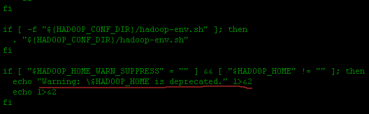 分别进入以上三个脚本中查看,会在hadoop-config.sh脚本中找到信息,出现此警告的原因是if条件语句同时满足条件而造成。如下图