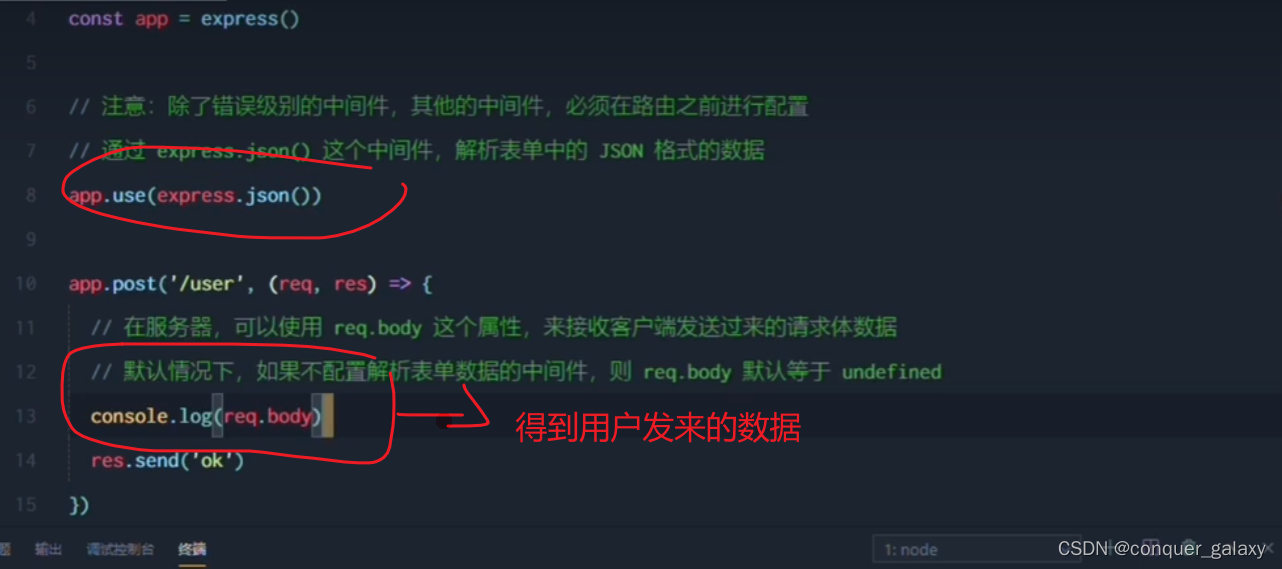 加入我们用户发来的是json数据格式的数据,那我们就要在前面写json的中间件