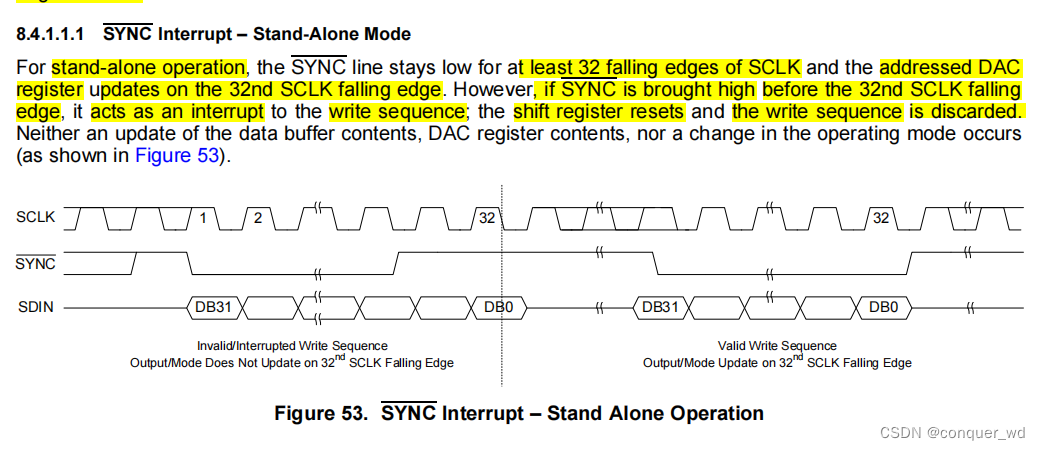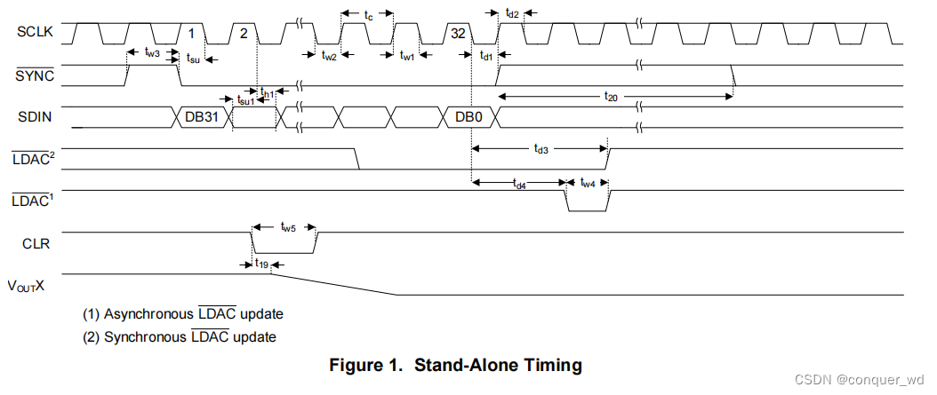 下图是正常的传输时序,第一个DB31时,在SYNC下降沿就要将数据发出,在1 的SCLK下下降沿对DB31进行采样,在SCLK的上升沿去更新DB30,同理在32个SCLK的上升沿去更新DB0的数据,在32个SCLK下降沿去采样DB0的数据,当数据更新完成之后,等一段td4去拉低LDAC,更新chan的值。表示一个chan的更新完成。 如果有多个通道需要更新的话,即假如多个32bit的配置数据需要更新,则更新完多个32bit的配置数据之后,然后等td4拉低LDAC更新所有通道的值,但是要注意每个chan(即每个32bit配置数据)之间的时间间隔要求。